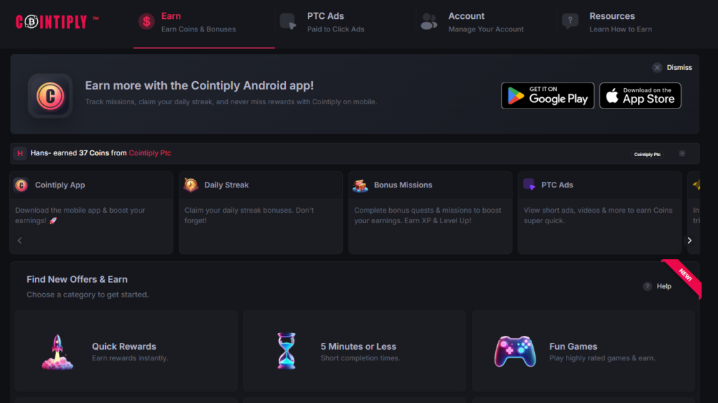 Cointiplyでは、サイト内で「Coins」と呼ばれる内部ポイントを貯め、それを仮想通貨へ交換します。主な収益方法は以下の通りです。